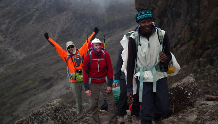 You will rise around 11:30 PM, and after some steaming tea and biscuits, you shuffle off into the night. Your 6-hour climb northwest up through heavy scree between the Rebmann and Ratzel glaciers to Stella Point on the crater rim is the most challenging part of the route for most climbers. At Stella Point (5,685 m/18,650 ft) you stop for a short rest and a chance to see a supremely sanguine sunrise. At Stella Point you join the top part of the Marangu Route, but do not stop here too long, as it will be extremely difficult to start again due to cold and fatigue. Depending on the season and recent storms, you may encounter snow on your remaining hike along the rim to Uhuru Peak. On the summit, you can enjoy your accomplishment and know that you are creating a day that you will remember for the rest of your life. After your 3-hour descent from the summit back to Barafu Camp, you will have a well-earned but short rest, collect your gear, and hike down a rock and scree path into the moorland and eventually into the forest to Mweka Camp (3,100 m/10,170 ft). This camp is in the upper forest, so you can expect mist or rain in the late afternoon. Dinner, and washing water will be prepared, and the camp office sells drinking water, soft drinks, chocolates, and beer!.
