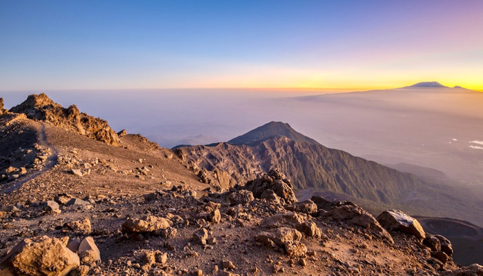We start early at around 1:30 a.m. to climb steeply to Rhino Point (3,800 m.) and on to Cobra Point (4350m). We reach the summit (4,566 m) for sunrise there is a possibility to see Kilimanjaro Peak above the clouds. The final part of the climb is along a spectacular narrow ridgeline between the sheer inner cliffs and the sloping outer wall of the crater. We take a short rest and brunch at Saddle Hut before continuing the descent to the Momella gate. The returning transfer will be waiting at Momella Gate to pick you to your hotel in Arusha/Moshi.